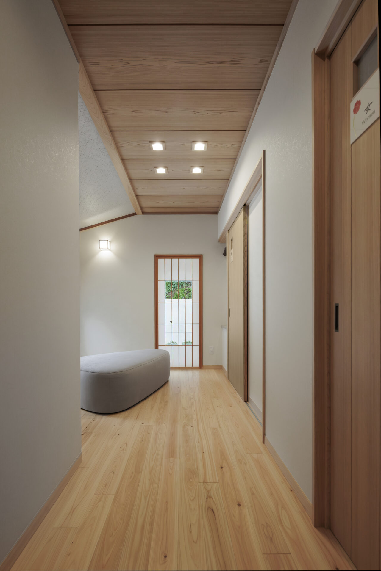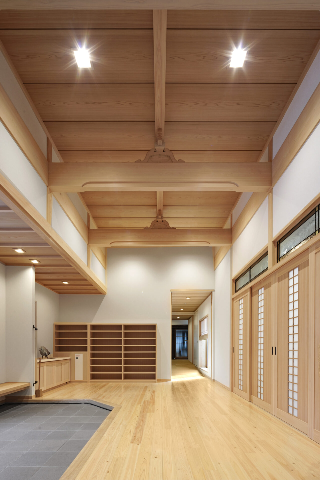 【客殿】玄関ホール:無垢(桧)フローリング、敷目天井