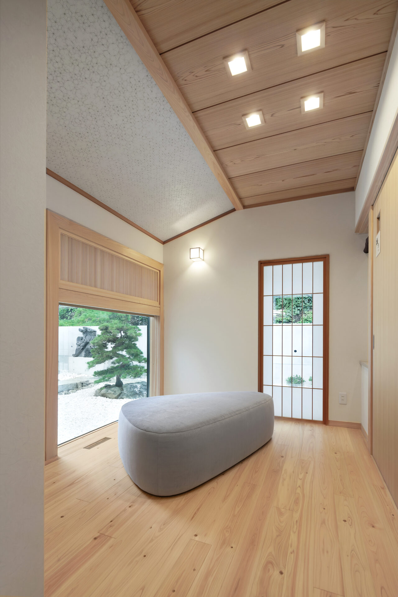 勾配天井には模様入りのクロスを採用しています。
