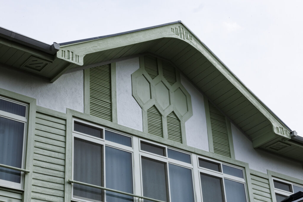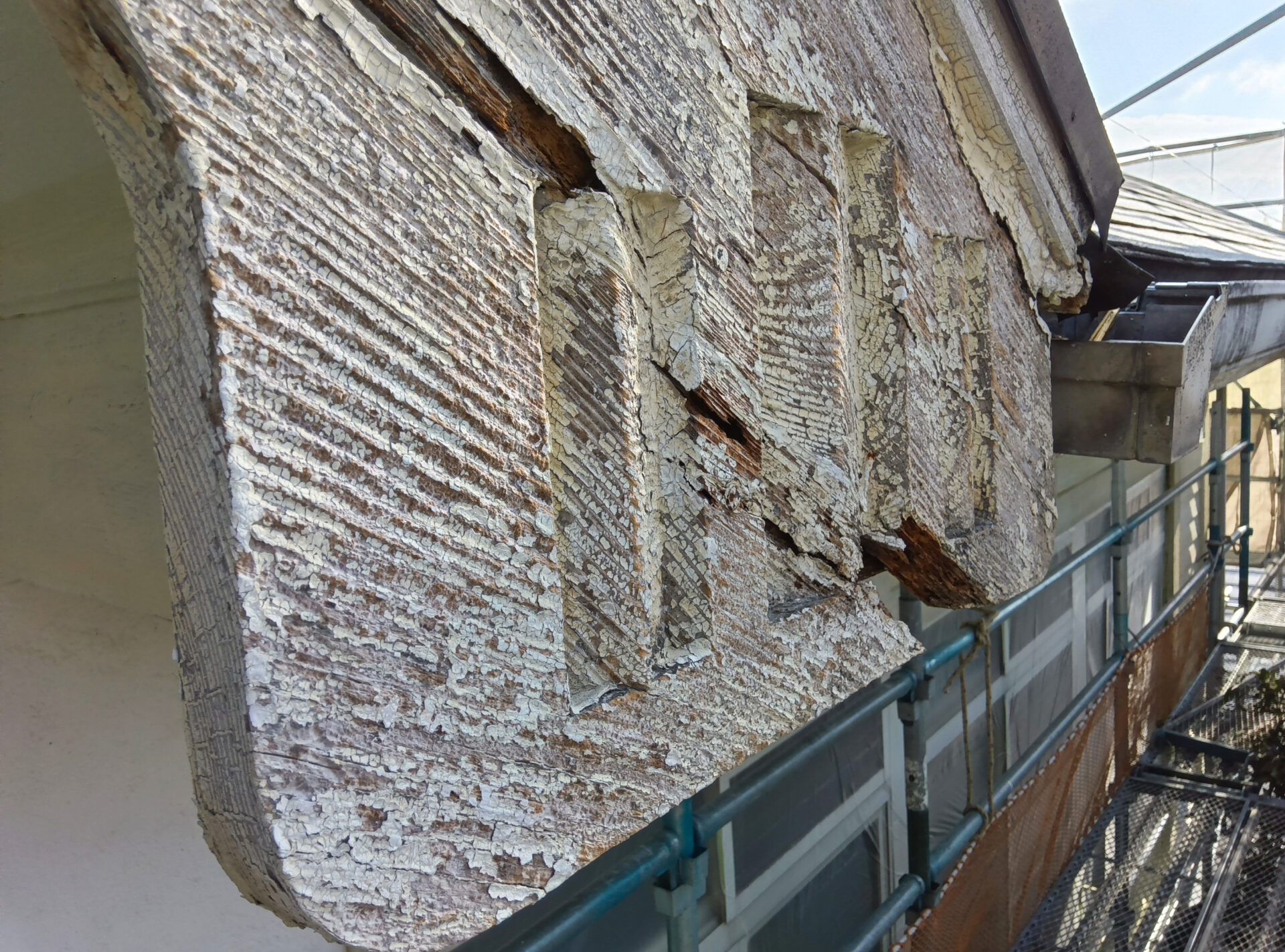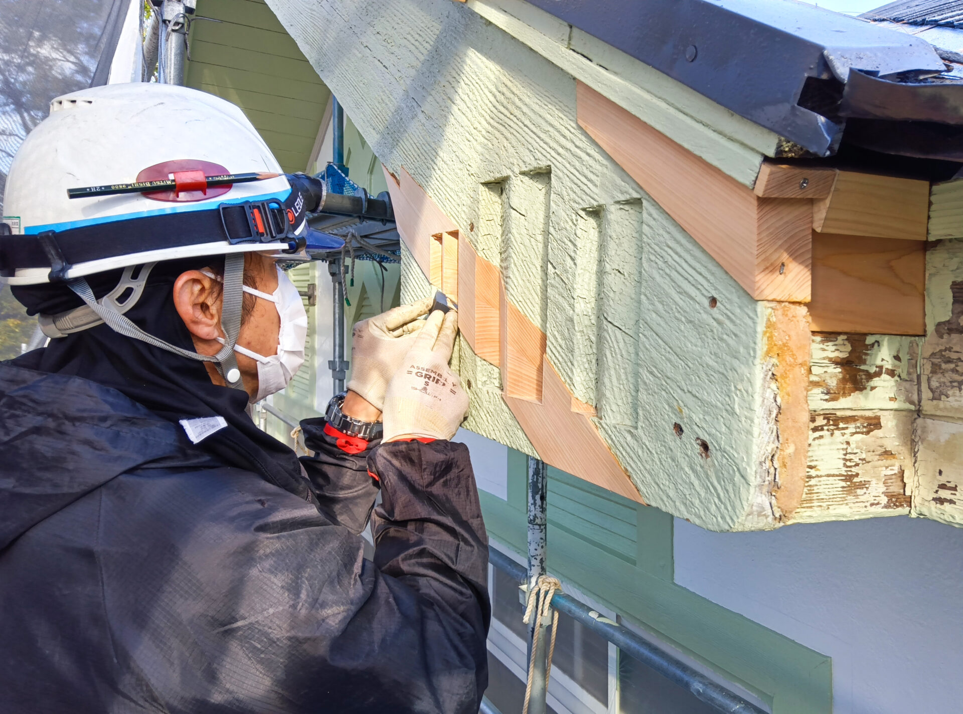 破風の腐朽部を埋木補修しました。